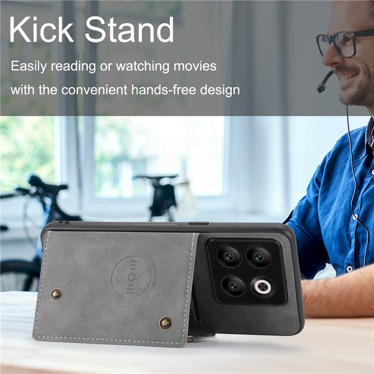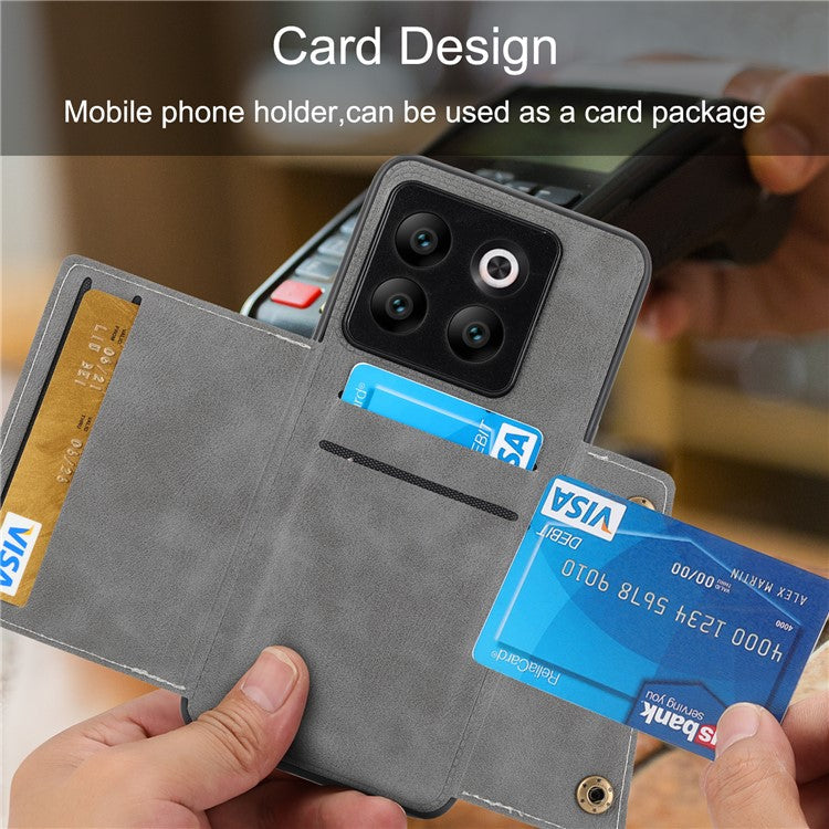 For OnePlus 10T 5G / Ace Pro 5G Dual Button Card Holder PU Leather Coated TPU Kickstand Case with Car Mount Metal Sheet - Grey