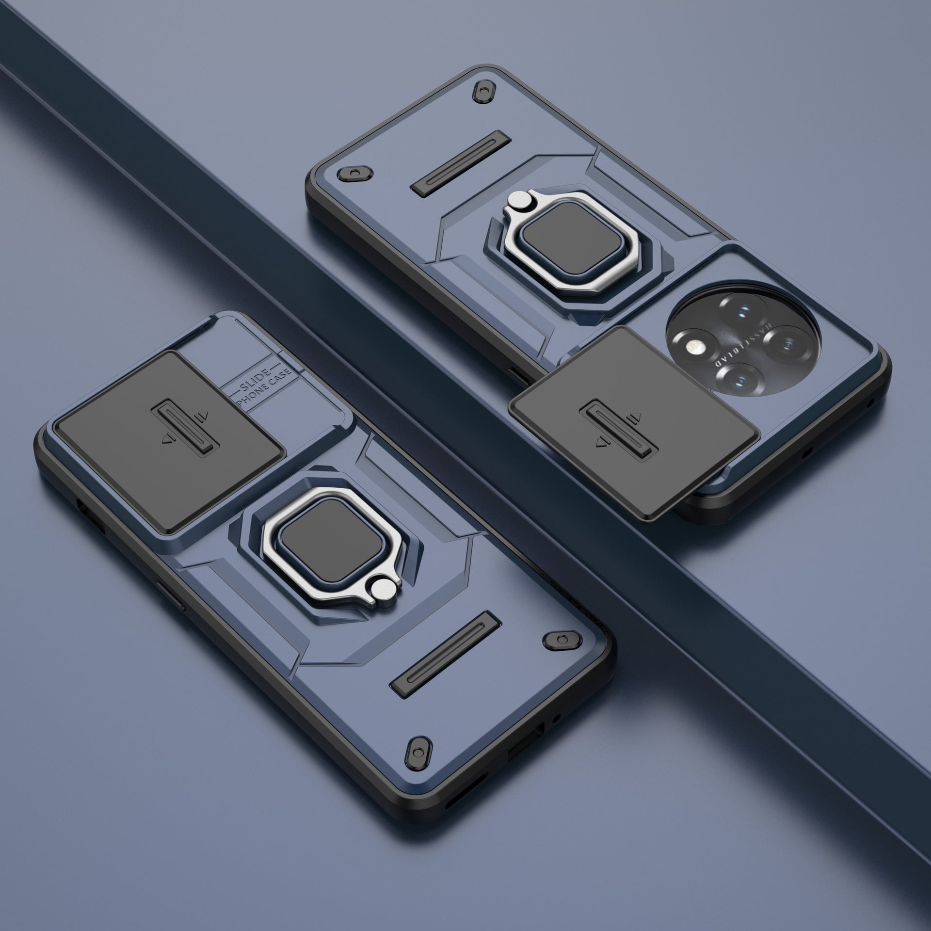 For OnePlus 11 5G Case Slide Lens Shield Ring Kickstand PC+TPU Phone Cover - Blue
