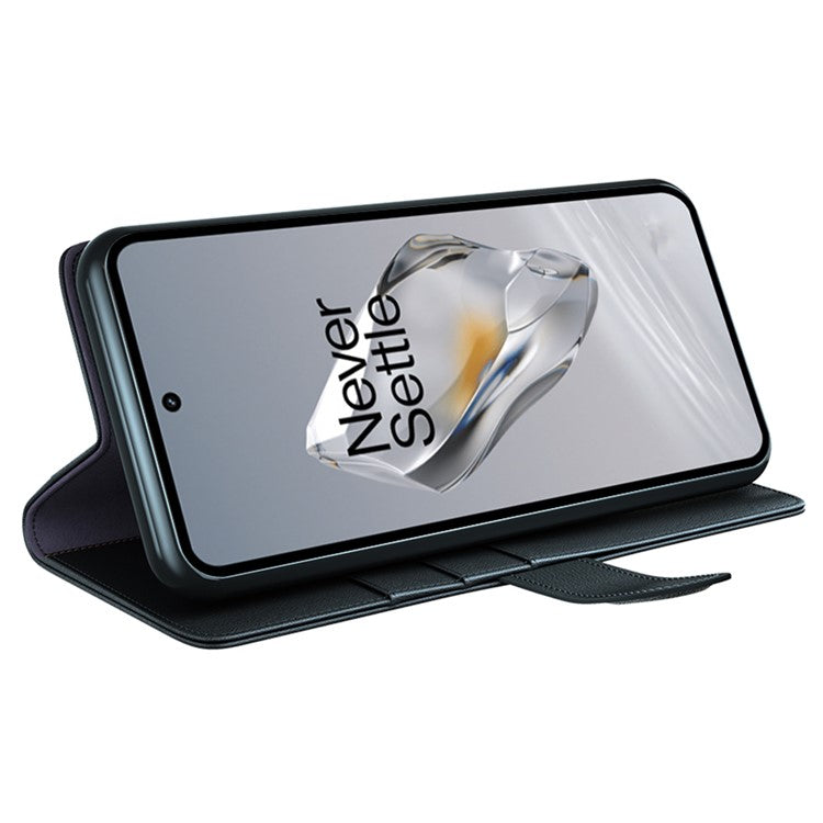 For OnePlus 12 5G Wallet Case Genuine Split Leather Phone Cover with TPU Shockproof Shell - Black