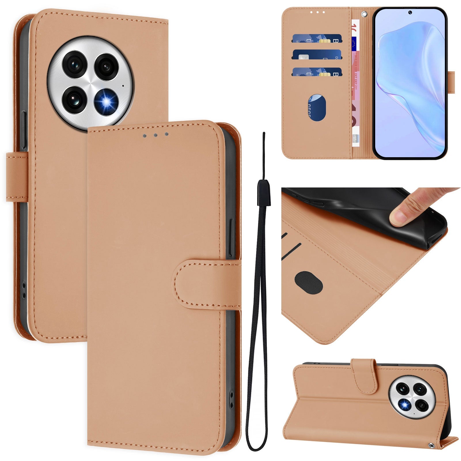 For OnePlus 13 Case Solid Color Wallet Leather Phone Cover with Strap - Nude