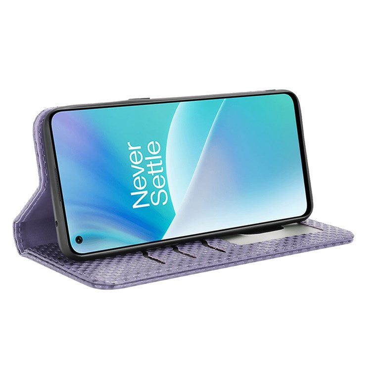 For OnePlus Nord 2T 5G Anti-dust Mobile Phone Bag Cover Grid Texture PU Leather Auto Closing Stand Wallet - Light Purple
