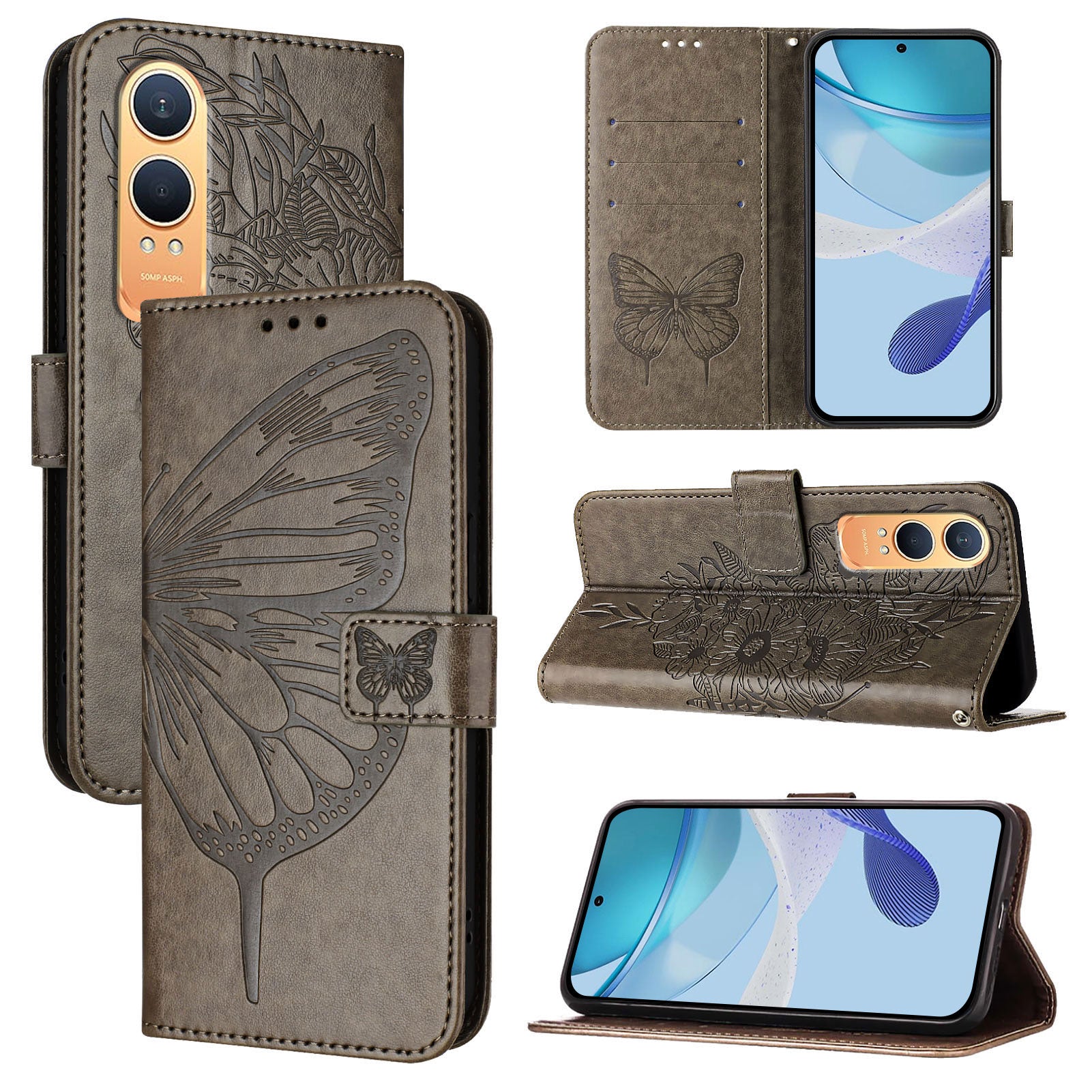 For OnePlus Nord CE4 Lite 5G Case YB Imprinting Series-4 Butterfly Flower Flip Wallet Leather Phone Cover - Grey