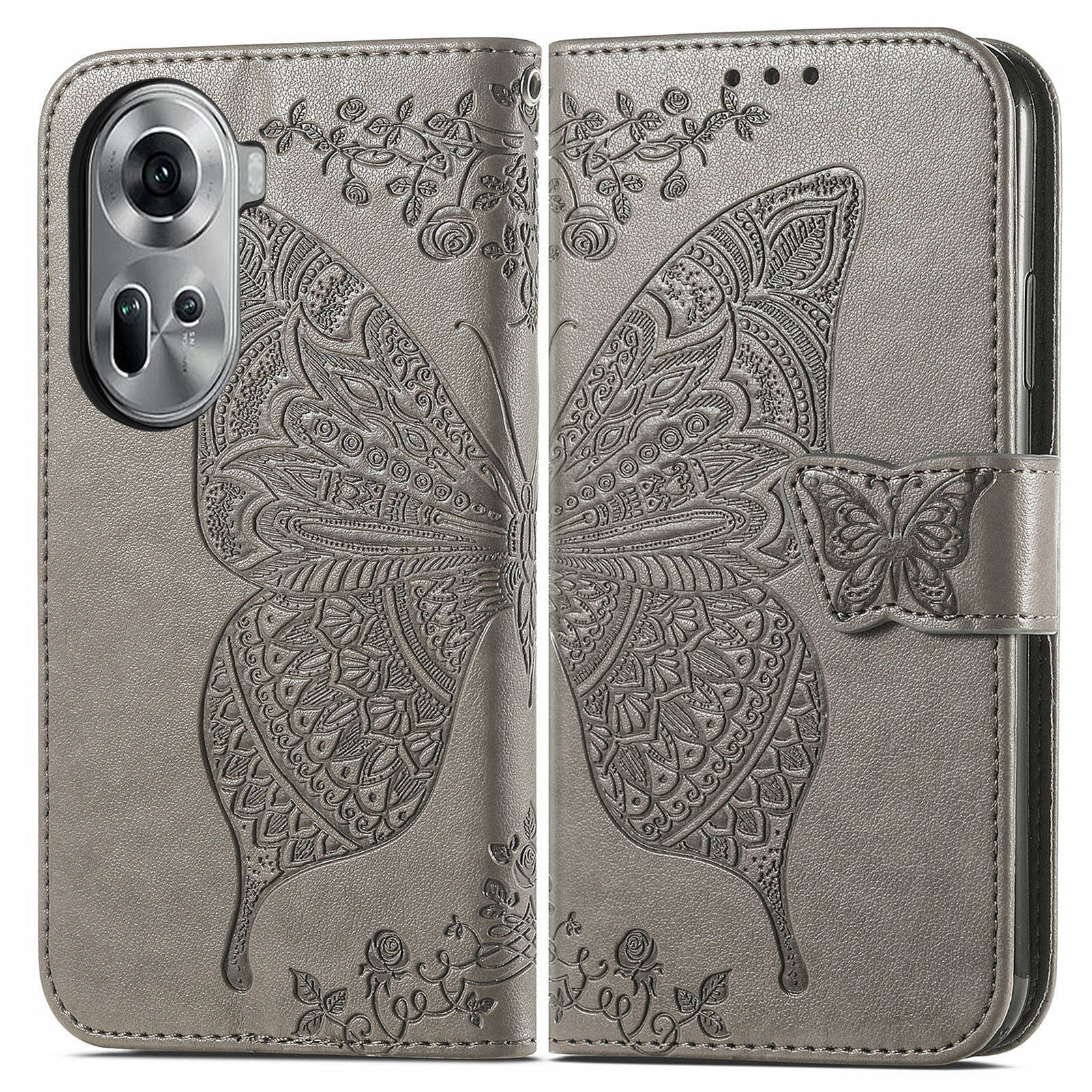 For Oppo Reno11 5G (Global) Case Wallet Butterfly Floral Imprinted Folio Leather Phone Cover - Grey
