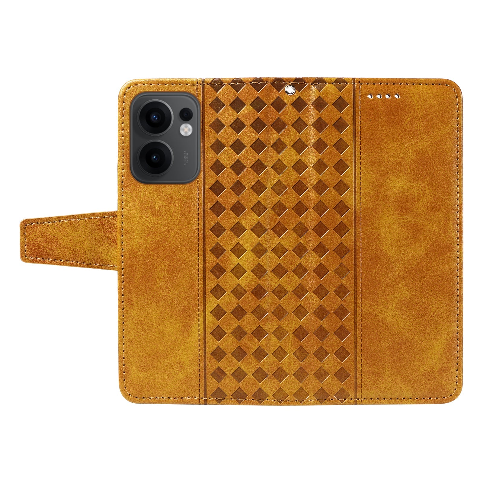 For Oppo Reno13 F 4G / Oppo Reno13 F 5G Leather Case Wallet Stand Grids Imprinted Phone Cover with Strap - Yellow