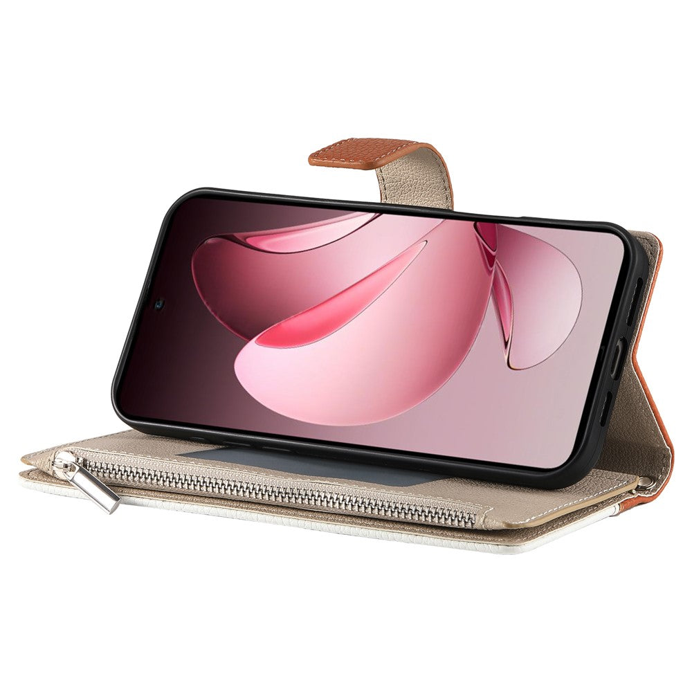 For Oppo Reno13 F 5G Case Zipper Wallet Color Splicing Leather Flip Phone Cover with Straps - Brown