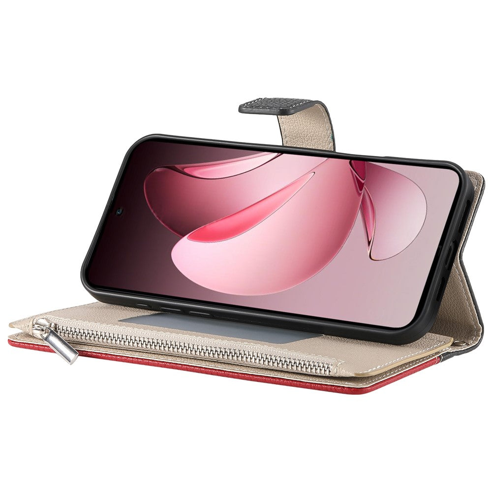 For Oppo Reno13 Pro 5G Case Zipper Wallet Color Splicing Leather Flip Phone Cover with Straps - Black