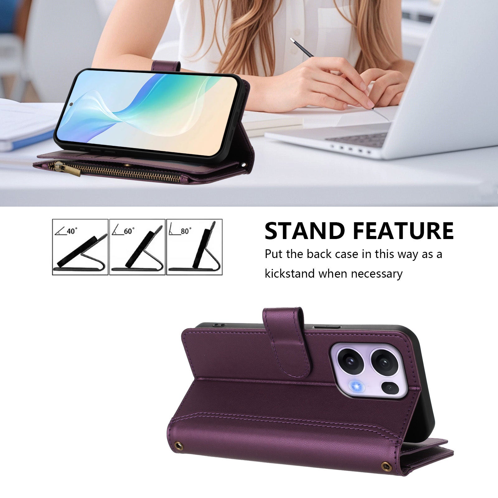 For Oppo Reno13 Pro 5G Leather Case 9 Card Slots Zipper Wallet Stand Phone Cover with Wrist Strap - Purple