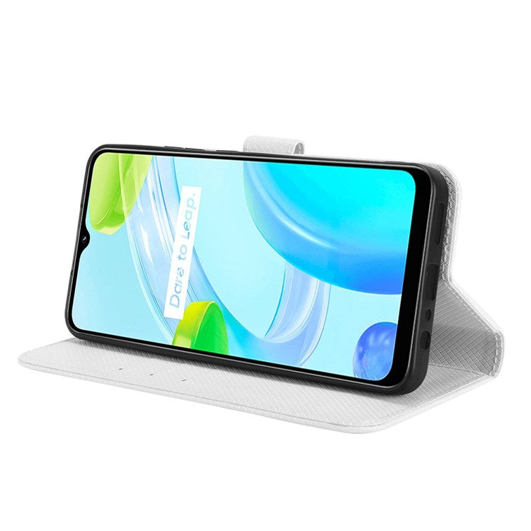 For Realme C30 4G Supporting Stand Wallet Phone Case Wrist Strap Diamond Texture PU Leather Phone Cover - White
