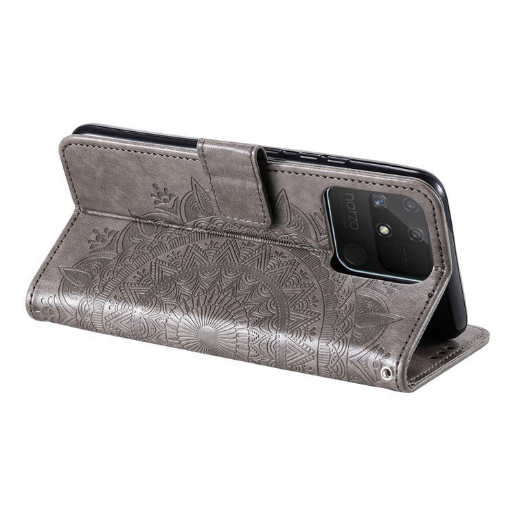 For Realme Narzo 50A PU Leather Phone Flip Cover, Wallet Stand Design Well-protected Imprinted Mandala Flower Phone Case - Grey