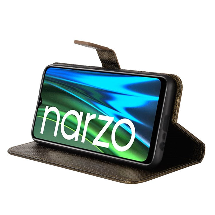 For Realme Narzo 50i PU Leather Wallet Diamond Texture Stand Cover Shockproof Cell Phone Case with Strap - Brown