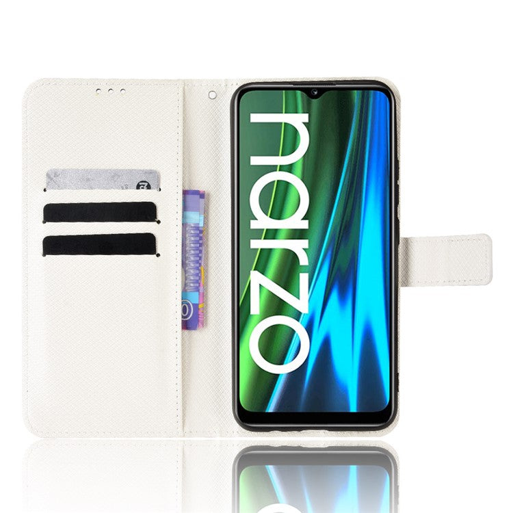 For Realme Narzo 50i PU Leather Wallet Diamond Texture Stand Cover Shockproof Cell Phone Case with Strap - White