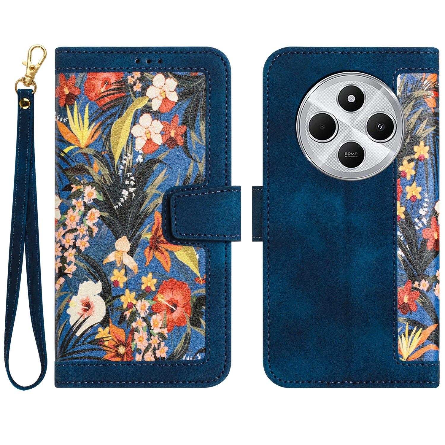 For Redmi 14C 4G Floral Pattern Leather Phone Case with Lanyard(Dark Blue)