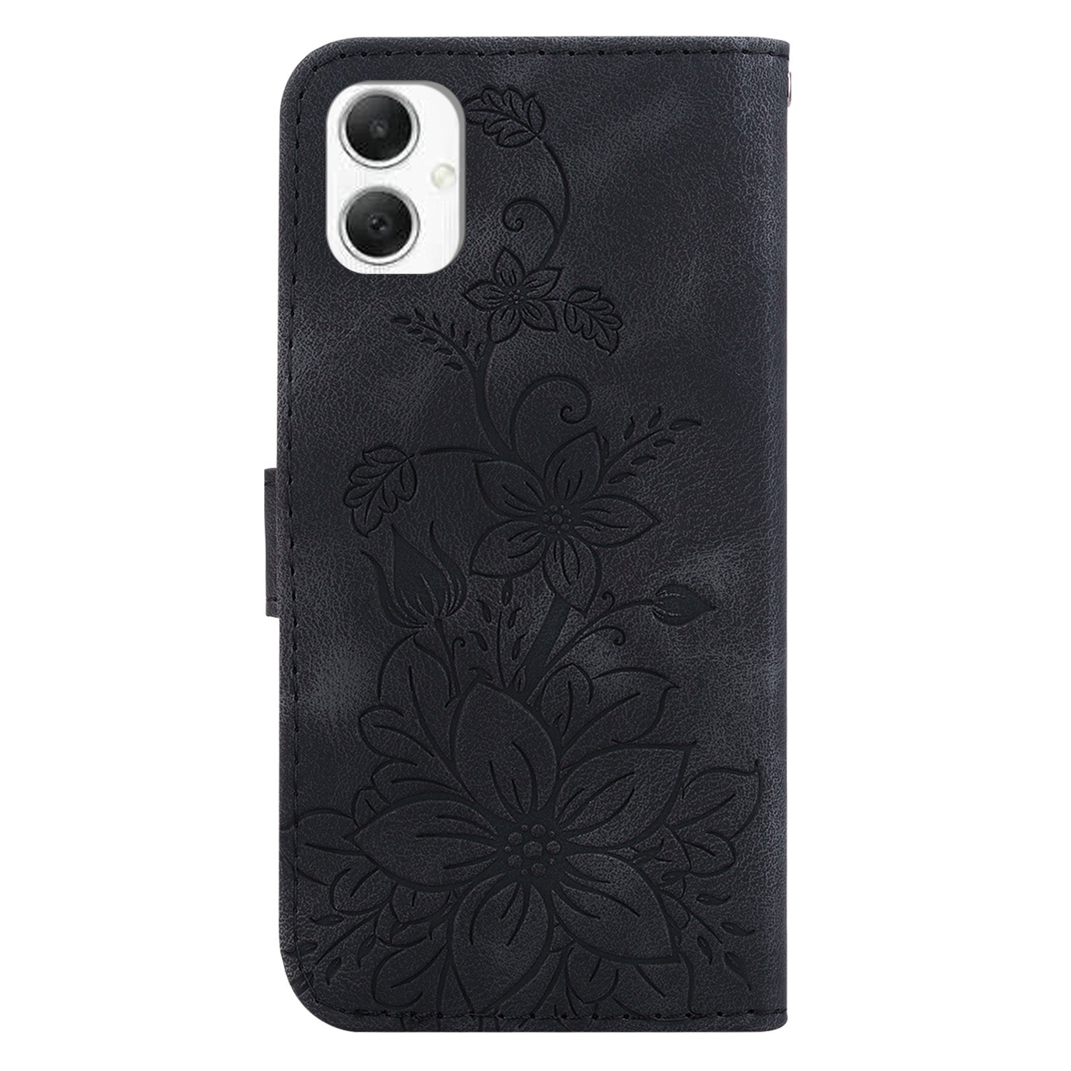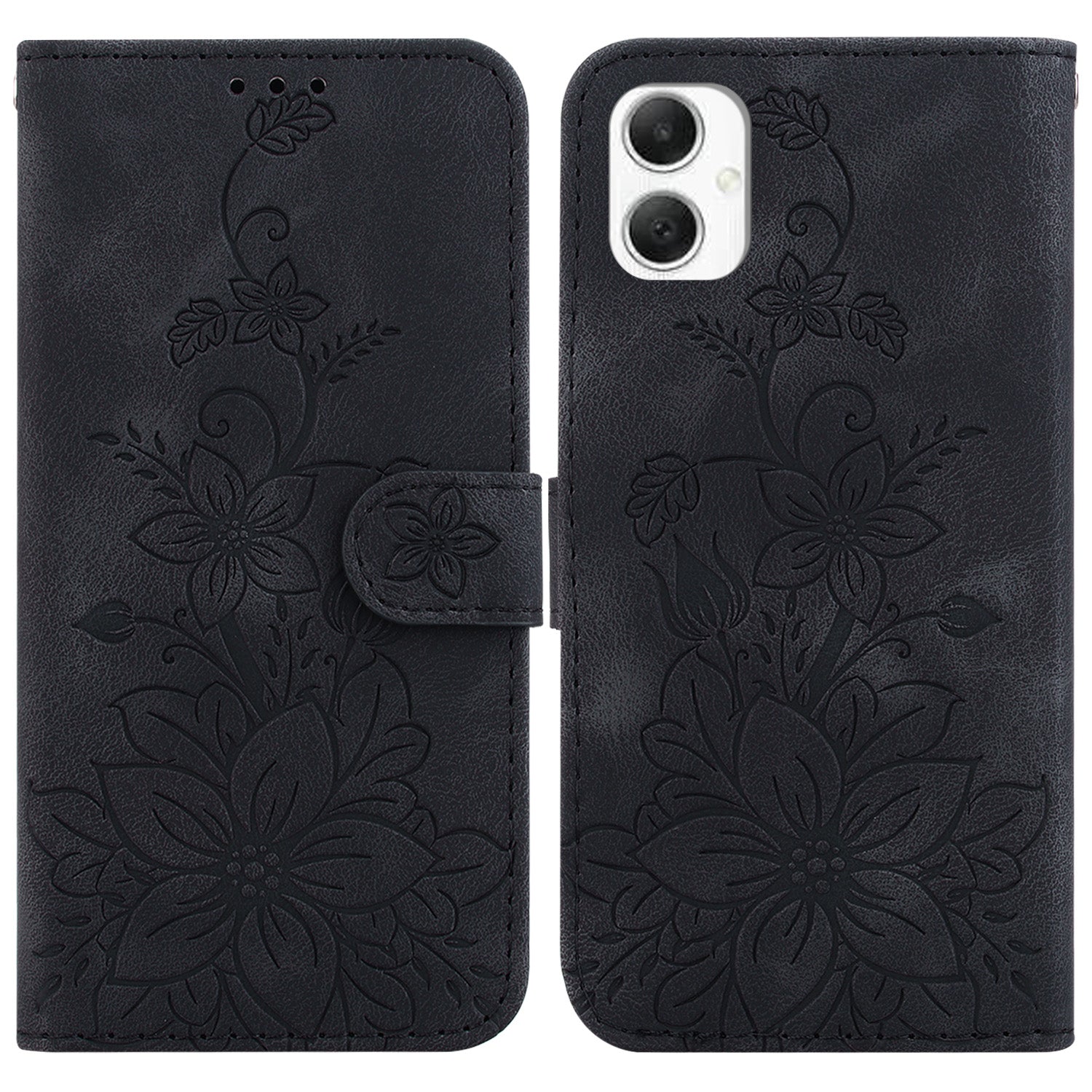 For Samsung Galaxy A06 Case Lily Flower Imprint Leather Phone Cover with Stand - Black