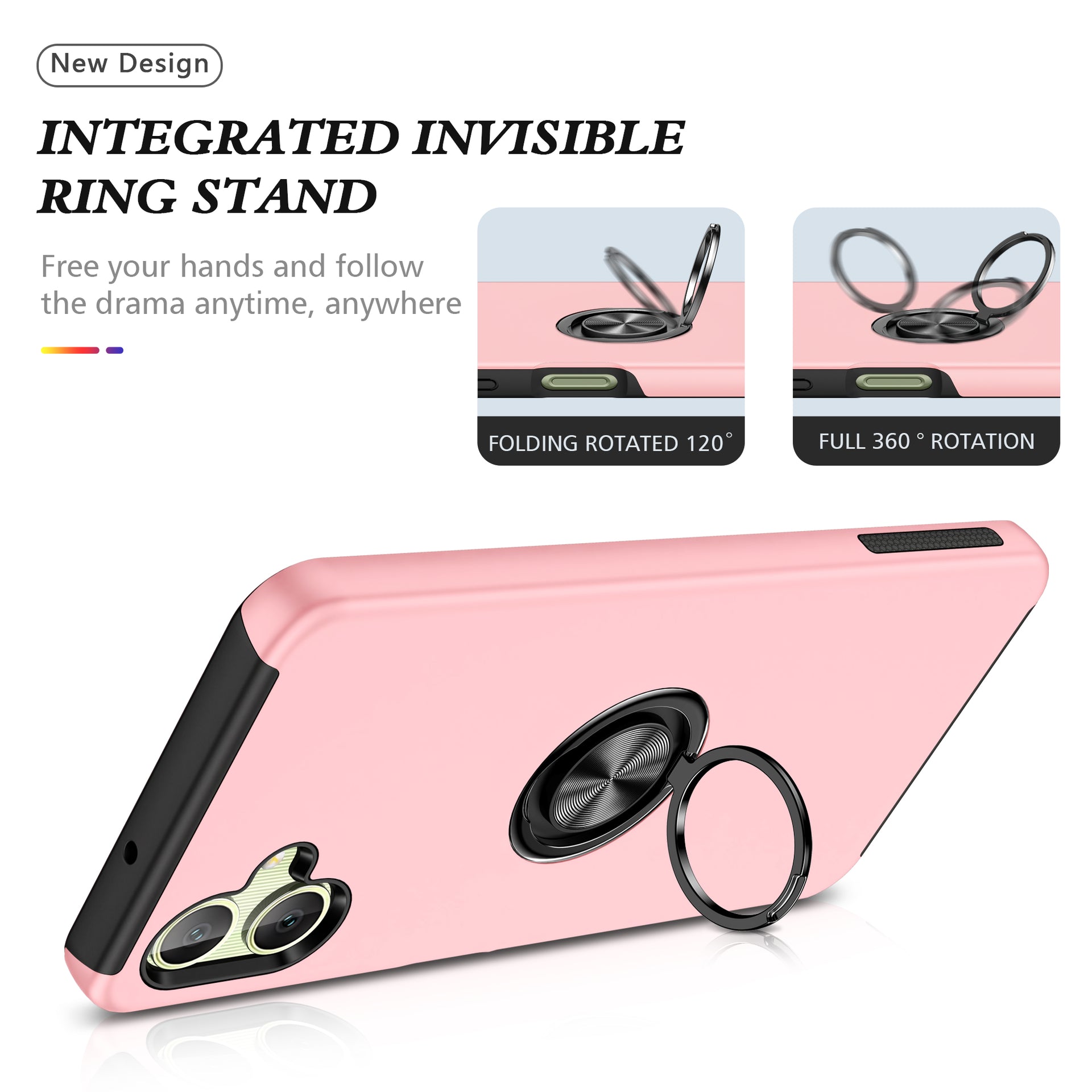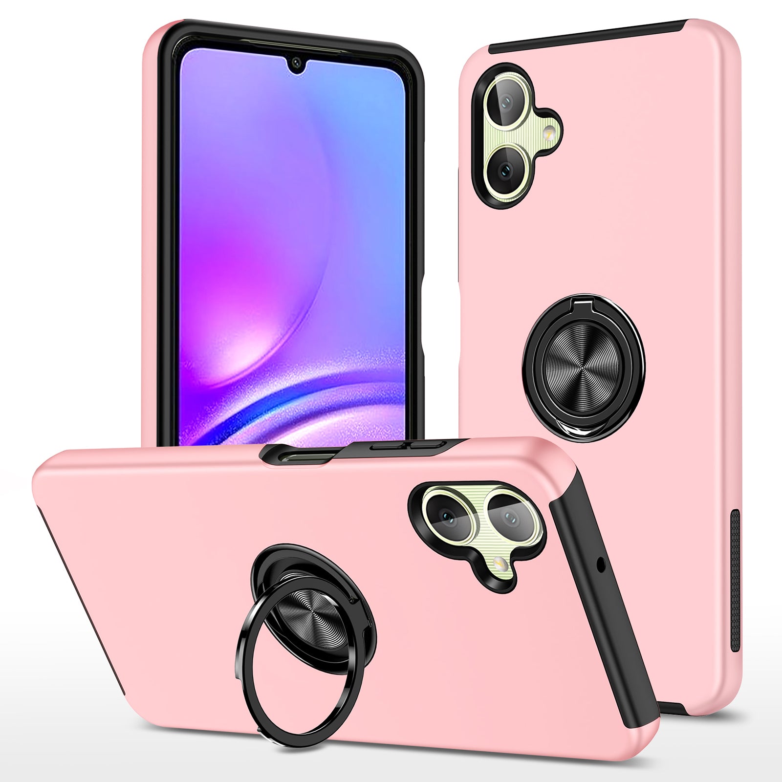For Samsung Galaxy A06 Case PC+TPU Phone Cover with Rotatable Ring Holder - Rose Gold