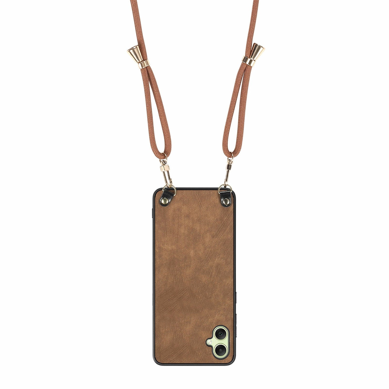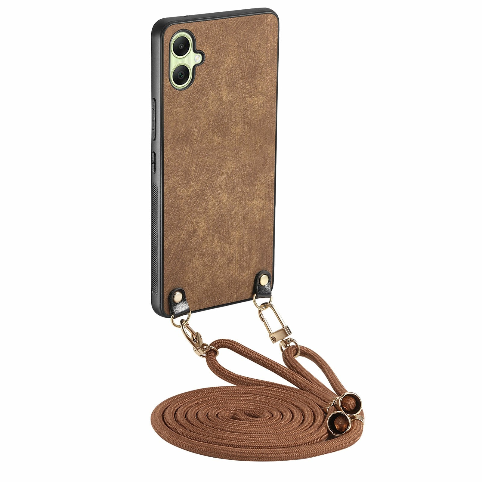 For Samsung Galaxy A06 Case Retro Texture Leather Coated PC+TPU Phone Cover with Hanging Rope - Brown