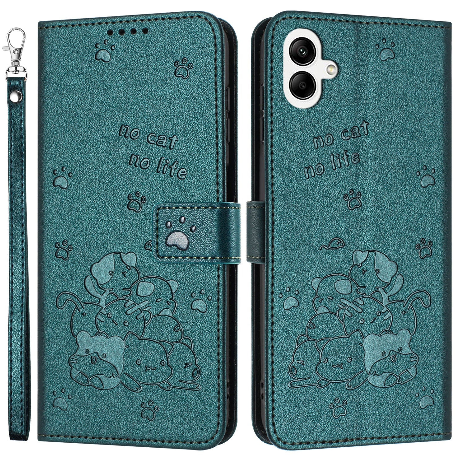 For Samsung Galaxy A06 Case with Strap Cats Imprint Leather Wallet Phone Cover - Blackish Green