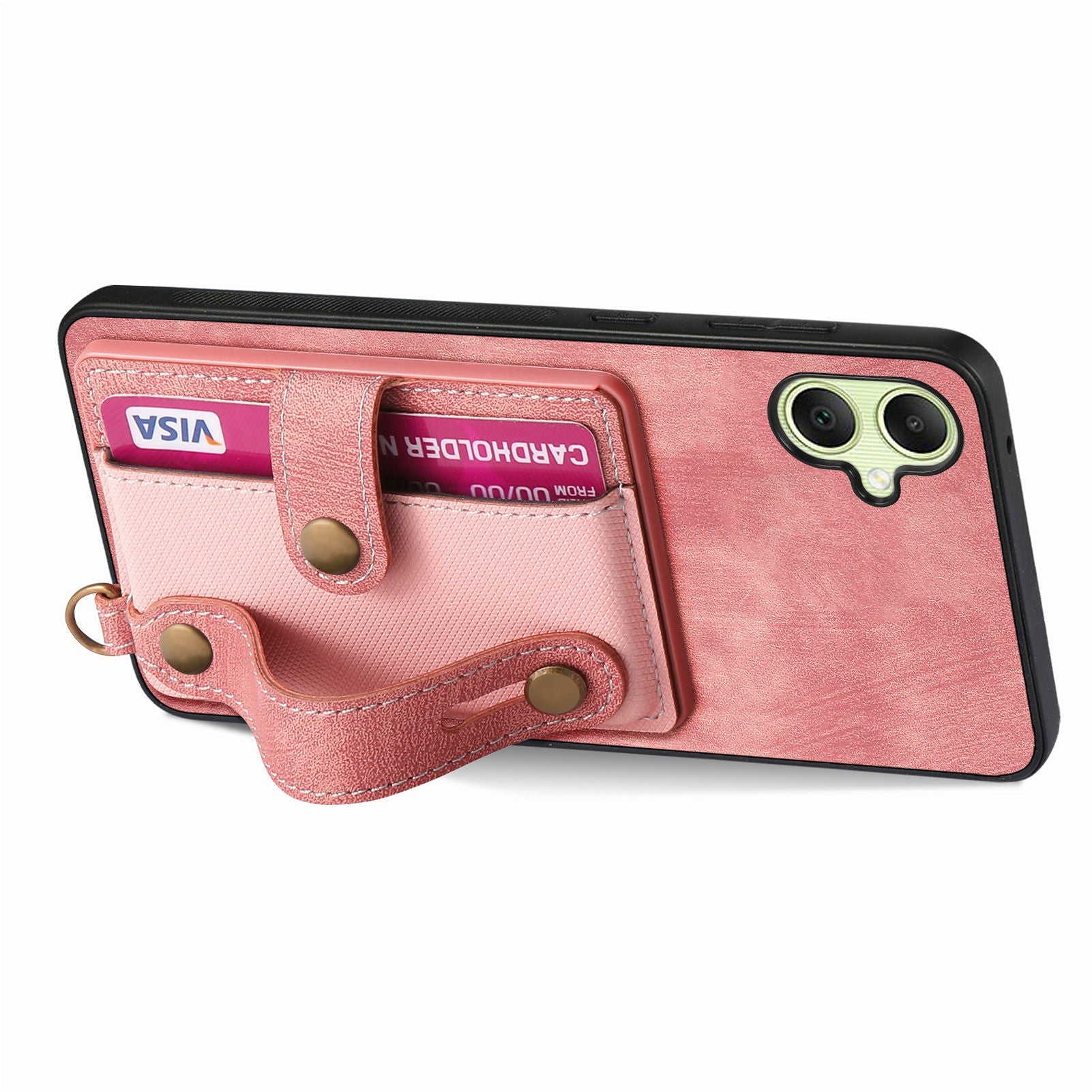 For Samsung Galaxy A06 Case Wristband Kickstand PU Leather Retro Back Cover Card Holder - Pink