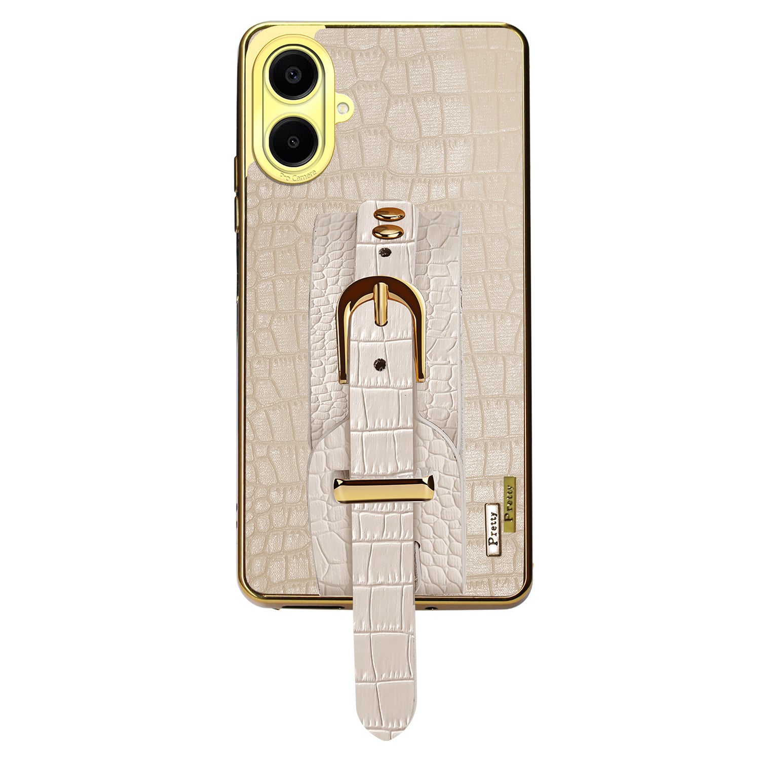 For Samsung Galaxy A06 Case Wristband Kickstand PU Leather+TPU 6D Electroplating Phone Cover - White