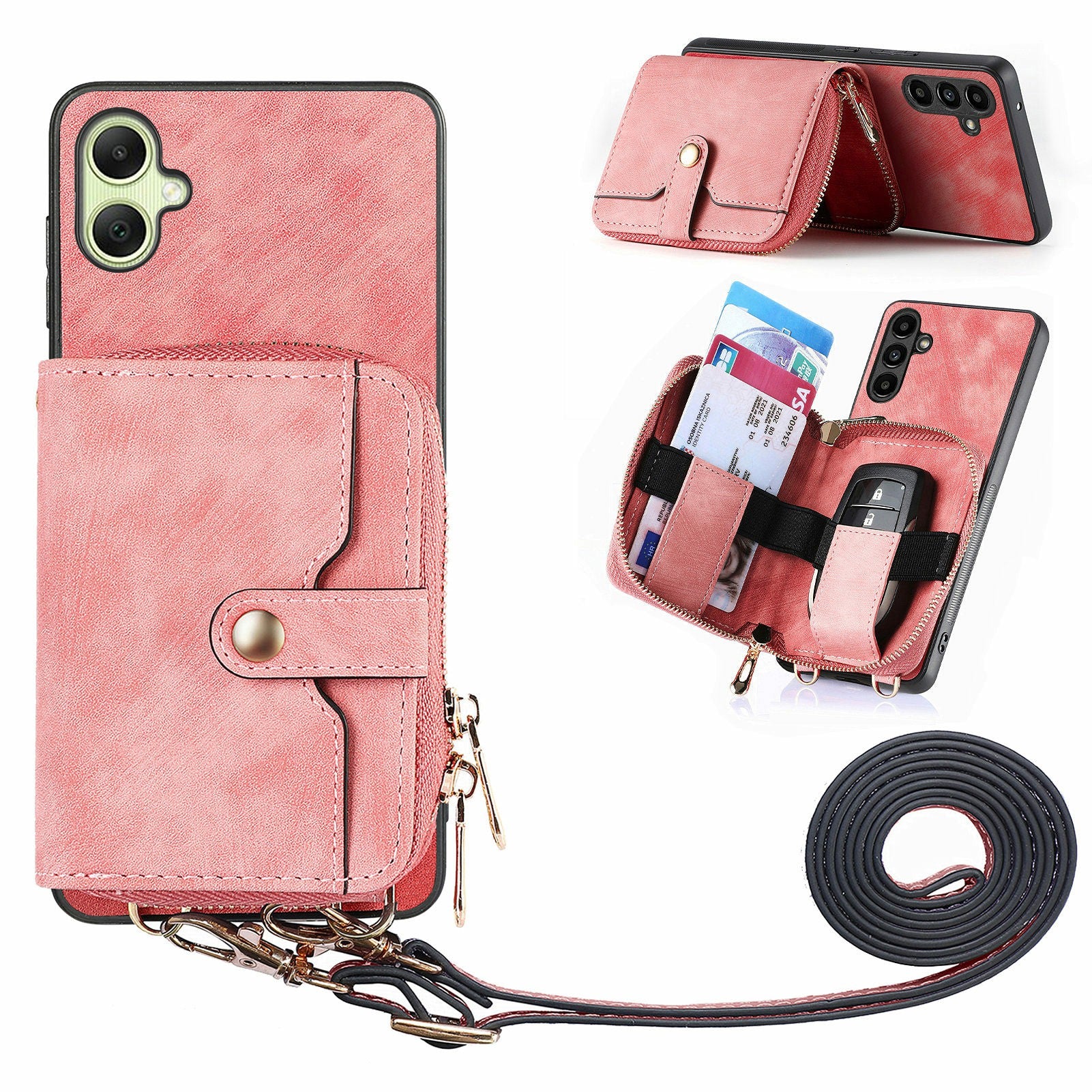 For Samsung Galaxy A06 Case Zipper Wallet Leather Phone Back Cover Kickstand with Shoulder Strap - Pink