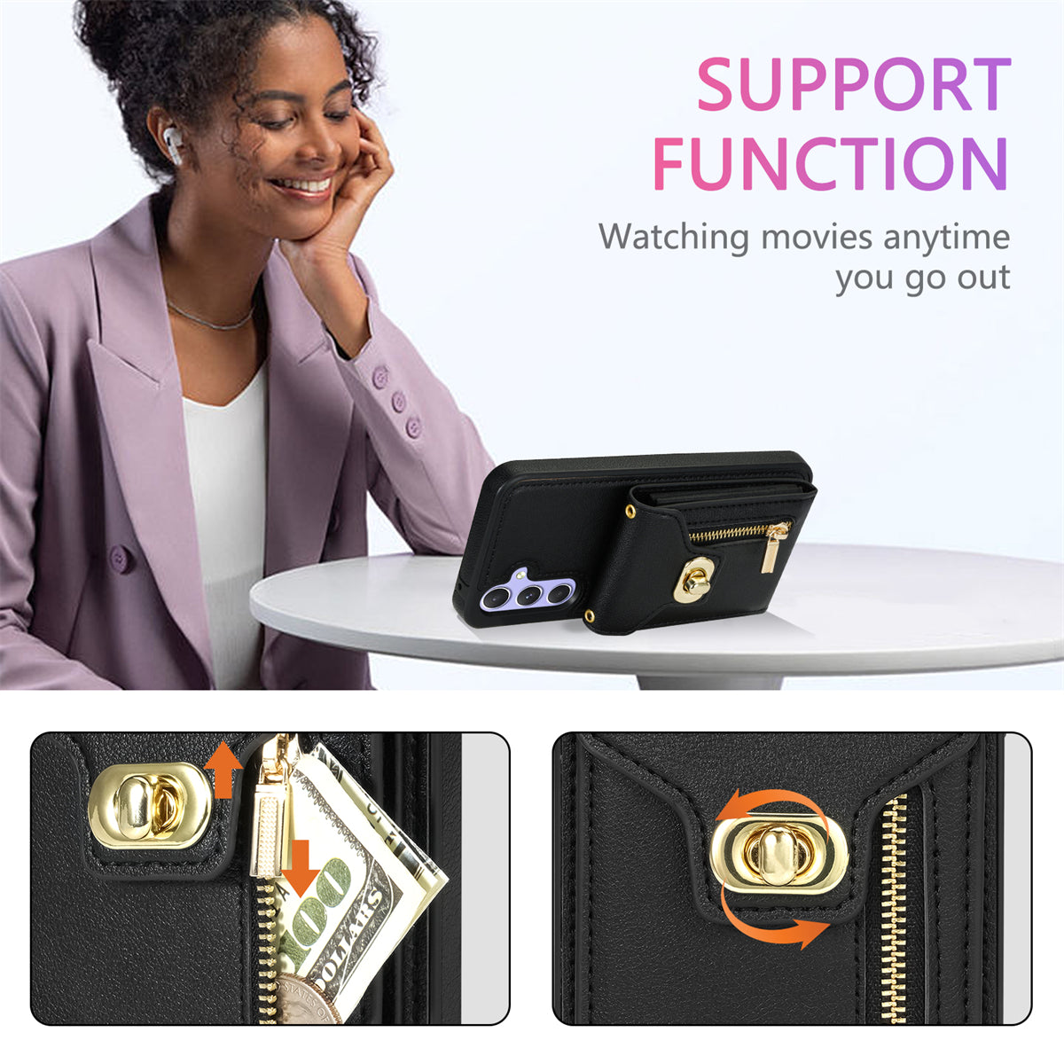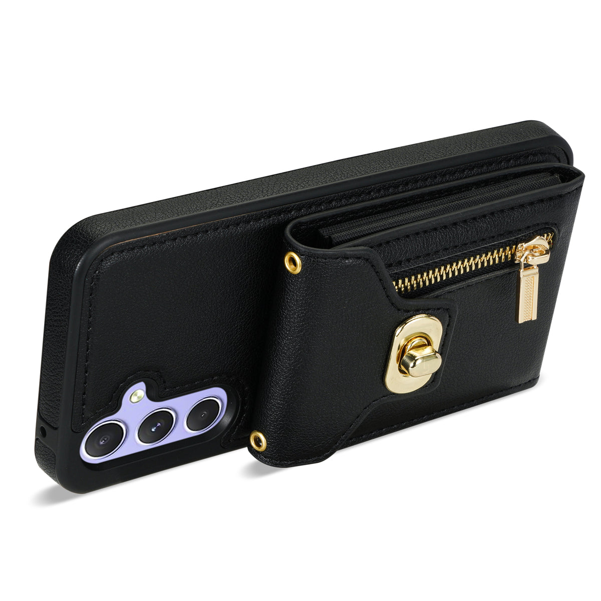 For Samsung Galaxy A16 5G  /  4G Case Leather + TPU Phone Cover with Card Bag, Shoulder Strap - Black