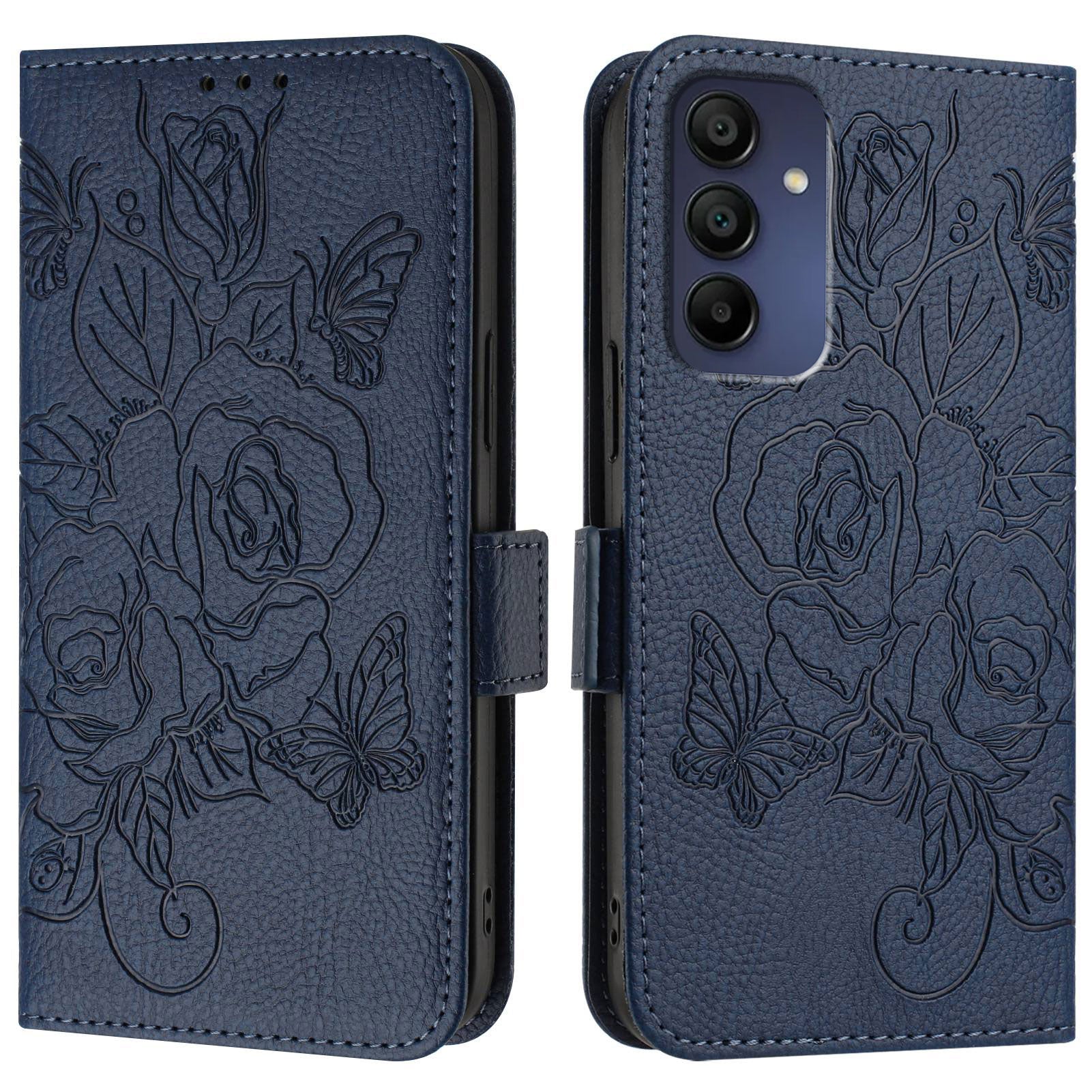For Samsung Galaxy A16 5G / A16 4G Case Rose Imprinted RFID Blocking Leather Phone Cover with Strap - Dark Blue