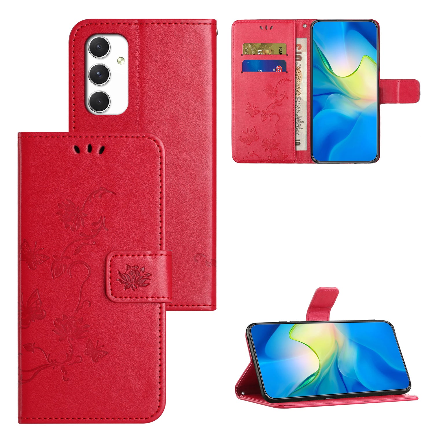 For Samsung Galaxy A16 5G / A16 4G Case Wallet Stand Imprinted Butterfly Flower PU Leather Phone Cover - Red