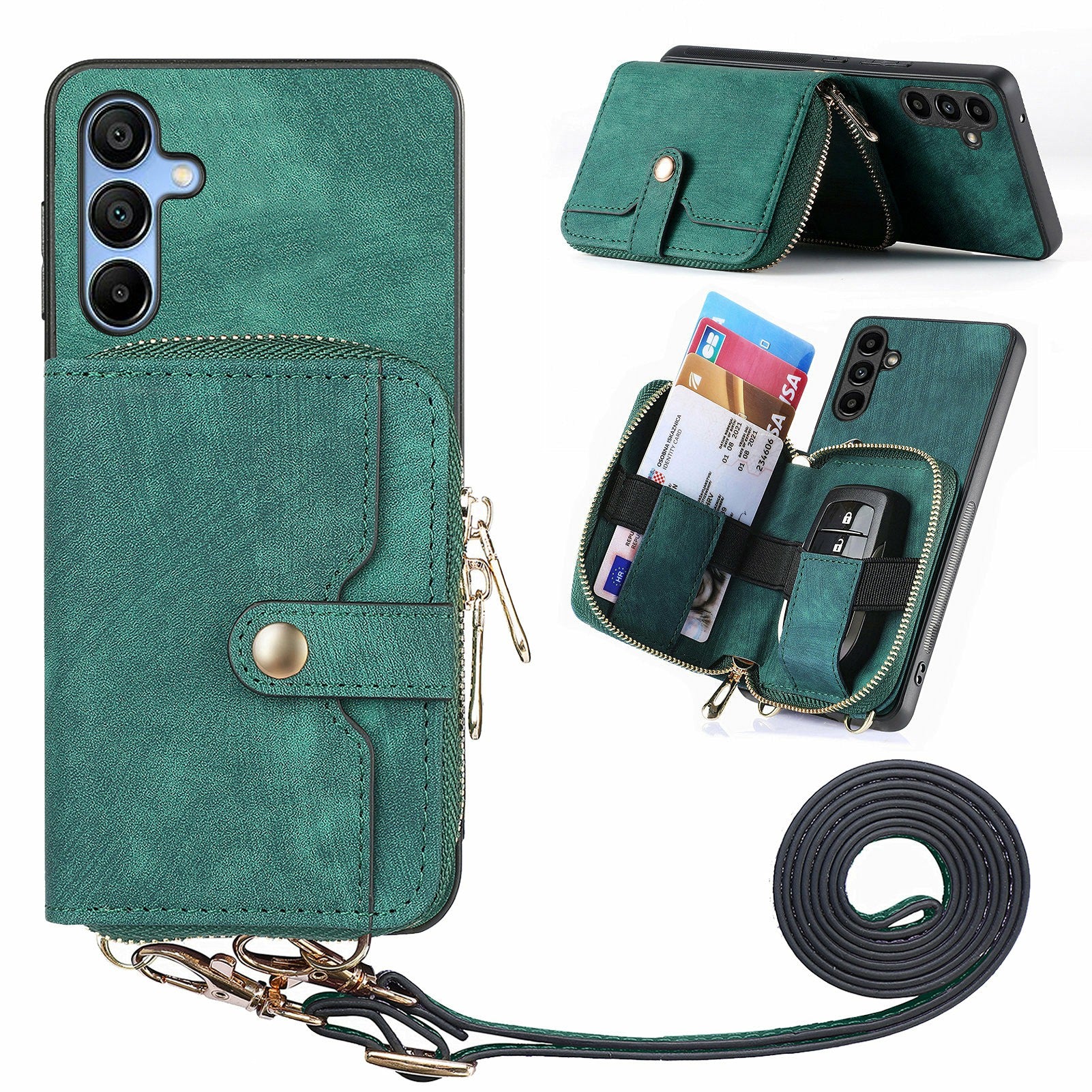For Samsung Galaxy A16 5G  /  A16 4G Case Zipper Wallet Leather Phone Back Cover Kickstand with Shoulder Strap - Green