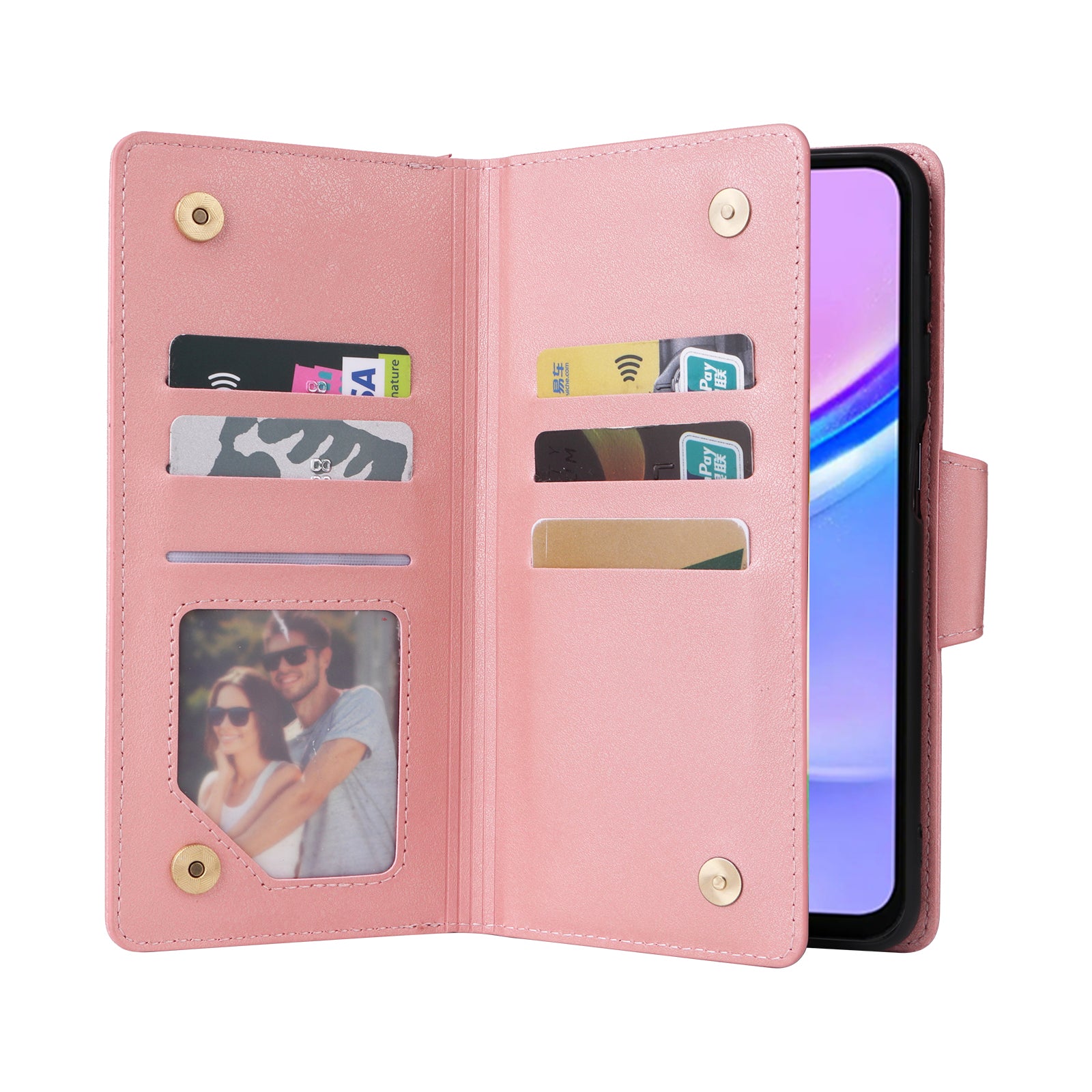 For Samsung Galaxy A16 5G / A16 4G Case Zipper Wallet Leather Stand Phone Cover Rivet Decor - Rose Gold
