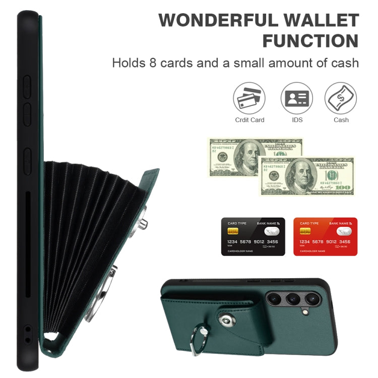 For Samsung Galaxy S24 5G Organ Card Bag Ring Holder PU Phone Case with Lanyard(Green)