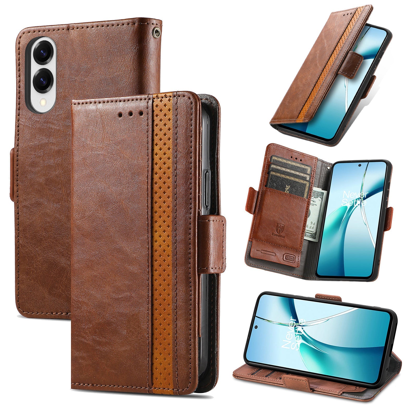 For Samsung Galaxy S25 Edge Case CASENEO 002 Series RFID Blocking Leather Wallet Stand Phone Cover - Dark Brown