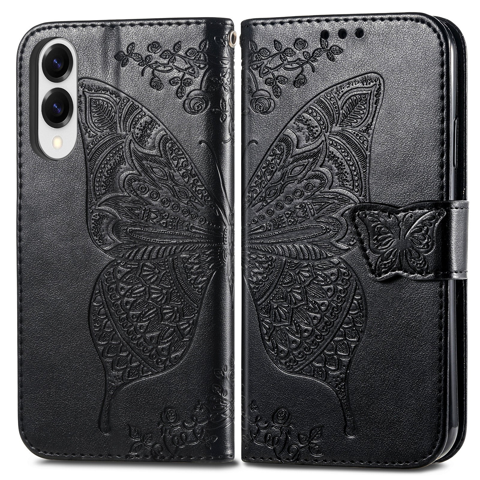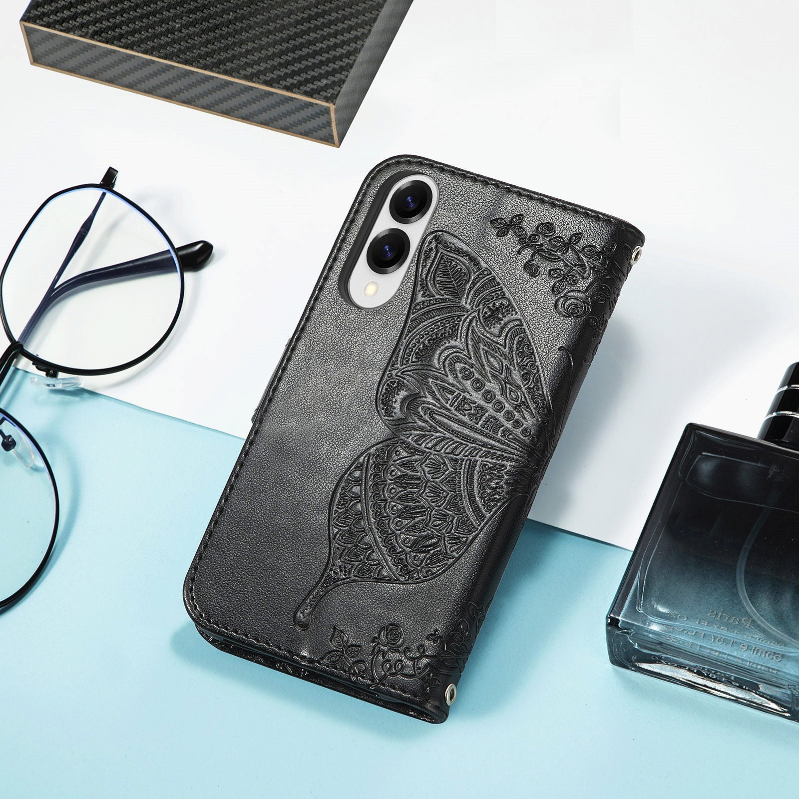 For Samsung Galaxy S25 Edge Case with Strap Butterfly Pattern PU Leather Wallet Phone Cover - Black