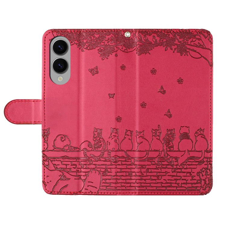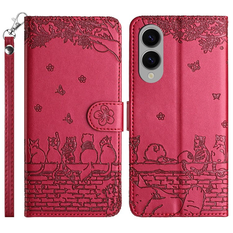 For Samsung Galaxy S25 Edge Case with Wrist Strap Leather Phone Cover Wall Cats Pattern - Red