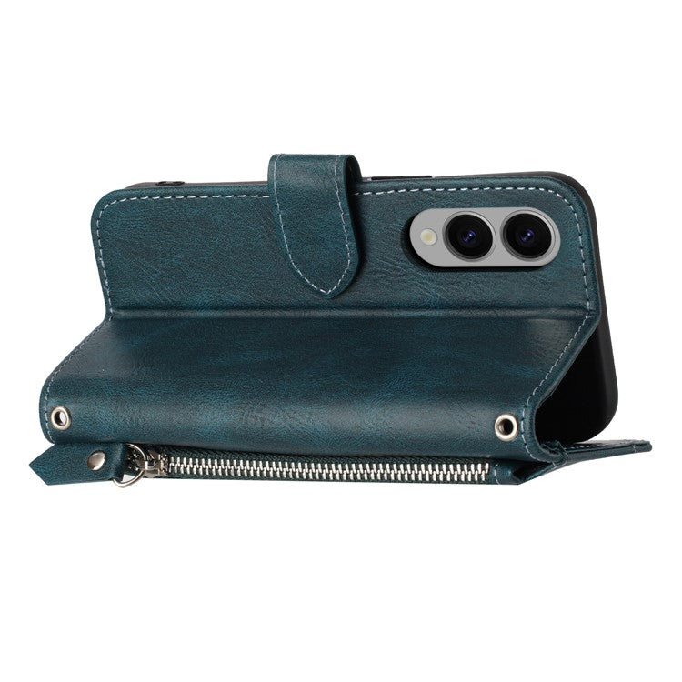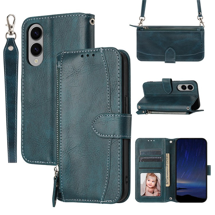 For Samsung Galaxy S25 Edge Case Zipper Pocket Leather Phone Cover with Crossbody Shoulder Strap - Blackish Green