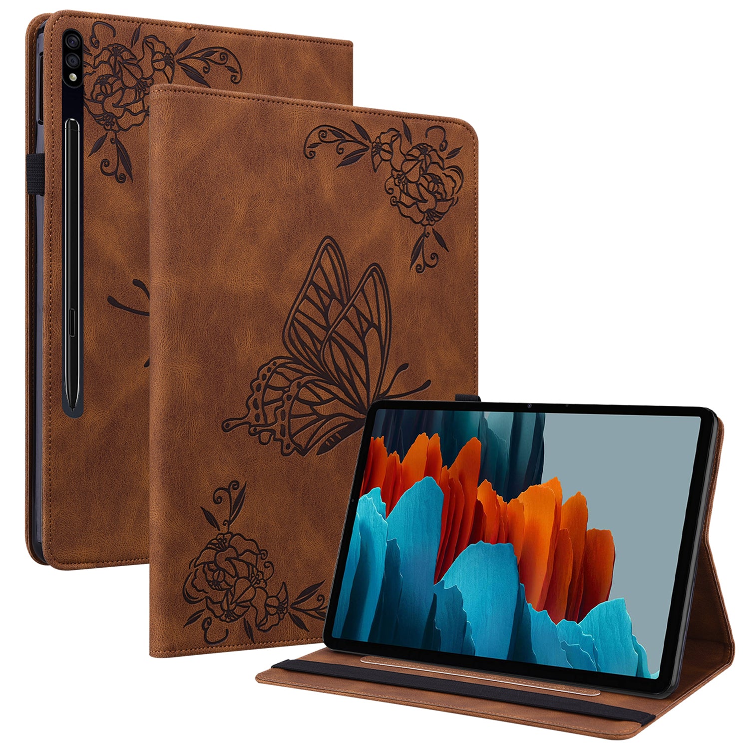 For Samsung Galaxy Tab S10 / S9 / S9 FE PU Leather Stand Cover Imprinted Butterfly Flower Card Holder Tablet Case - Brown