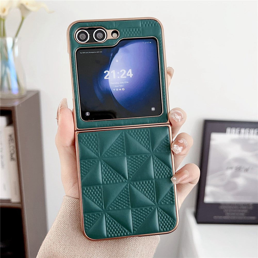 For Samsung Galaxy Z Flip7 FE 5G / Z Flip6 5G / Z Flip5 5G Case Electroplating Frame Leather + PC Grid Texture Phone Cover - Dark Green