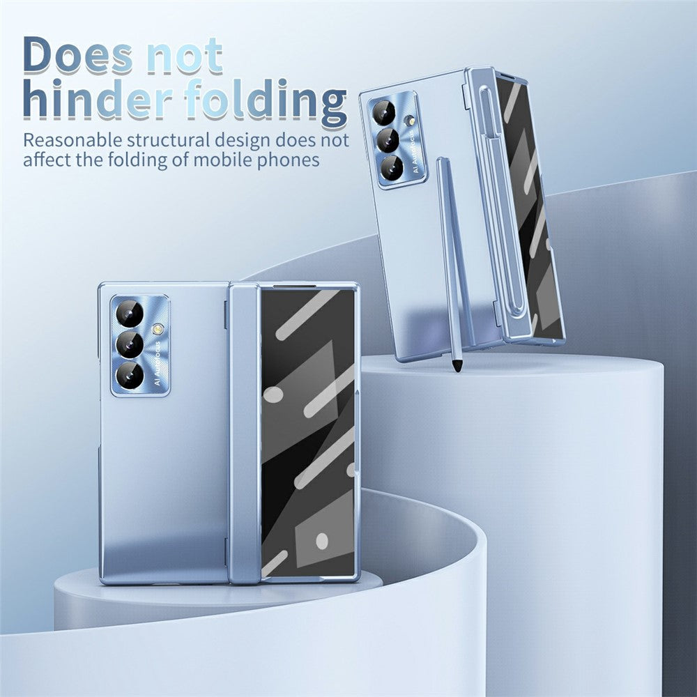 For Samsung Galaxy Z Fold7 5G Case Dual Hinge Electroplated PC Phone Cover with Tempered Glass Film / Stylus - Blue