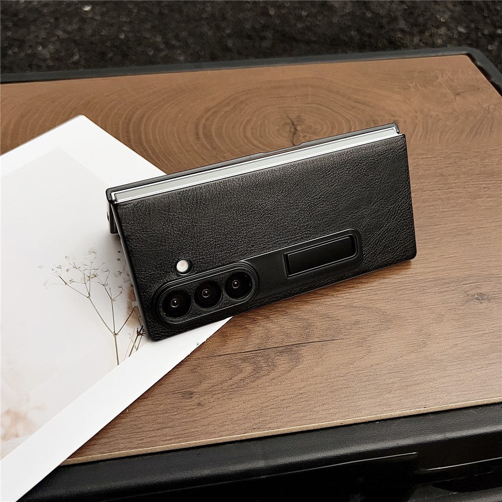 For Samsung Galaxy Z Fold7 5G Case Kickstand Leather Coated PC Folding Phone Cover - Black