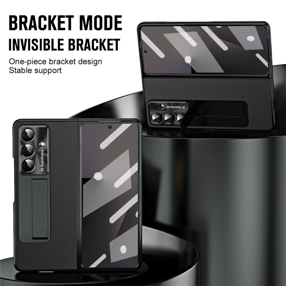 For Samsung Galaxy Z Fold7 5G Case Kickstand Leather + PC Phone Cover with Tempered Glass Film - Black