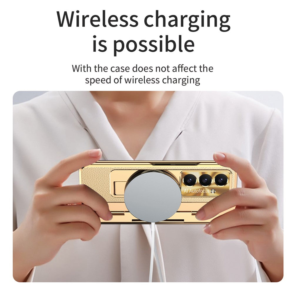 For Samsung Galaxy Z Fold7 5G Case Kickstand Leather + PC Phone Cover with Tempered Glass Film / Stylus - Gold + Gold
