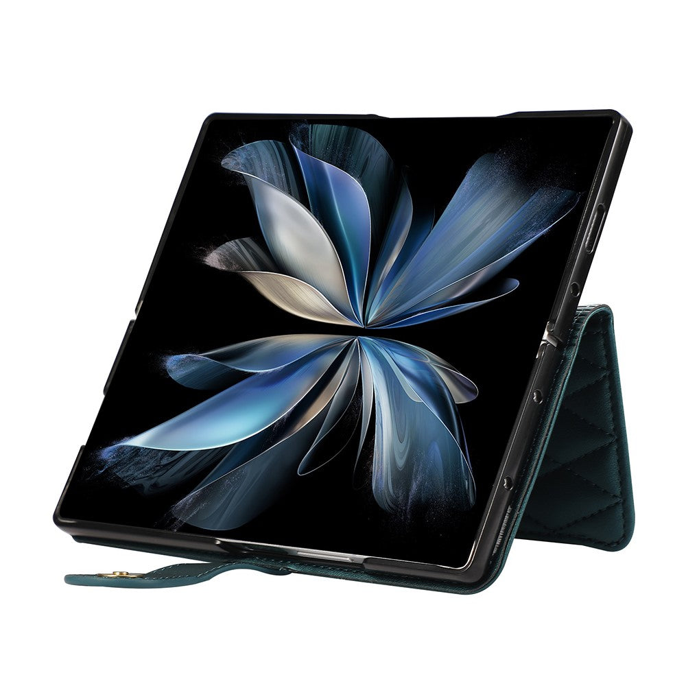 For Samsung Galaxy Z Fold7 5G Case Multi Card Slots Zipper Rhombus Leather Phone Cover with Wrist Strap - Green