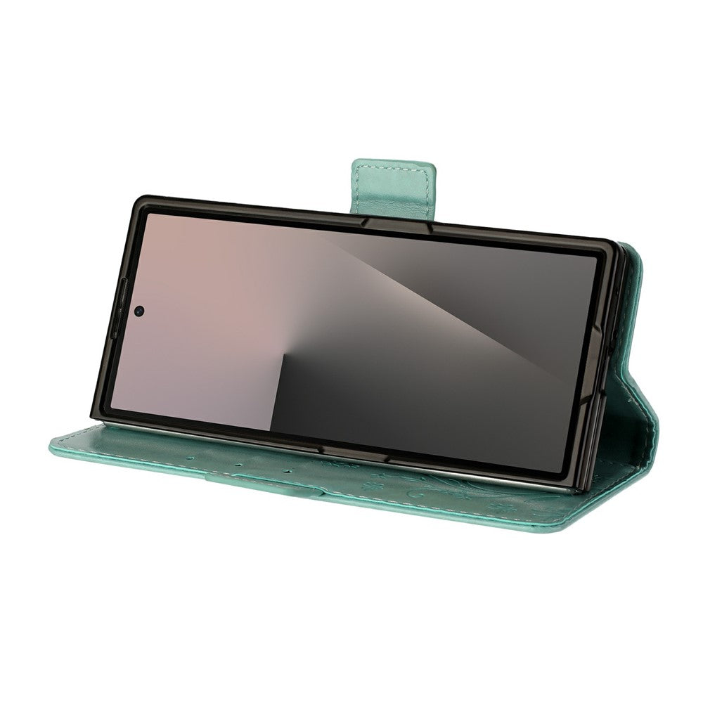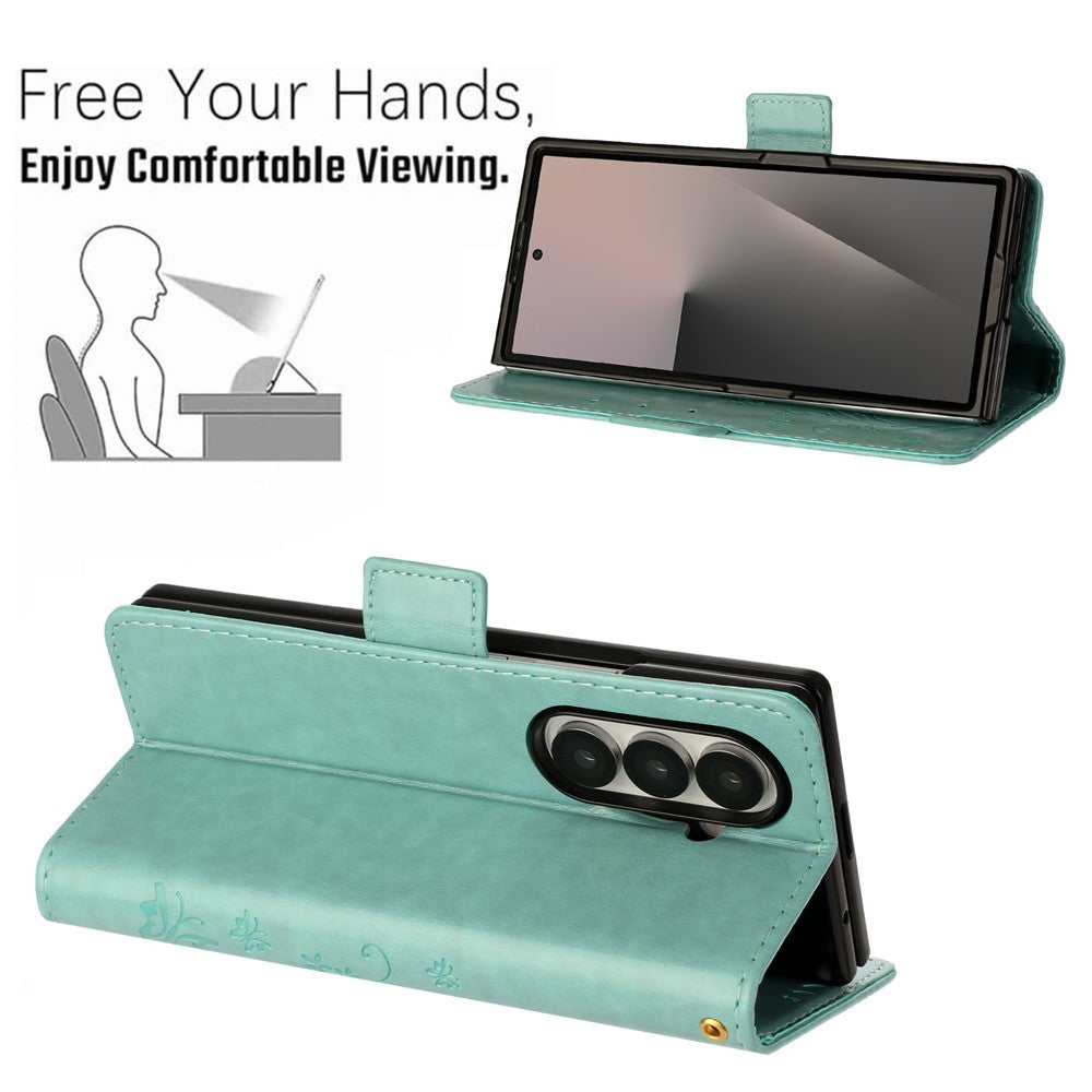 For Samsung Galaxy Z Fold7 5G Leather Wallet Case Butterfly Flower Imprint Phone Cover with Strap - Baby Blue