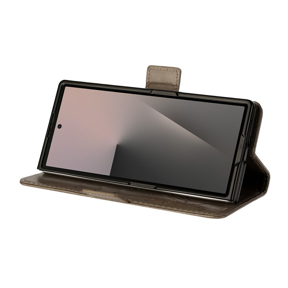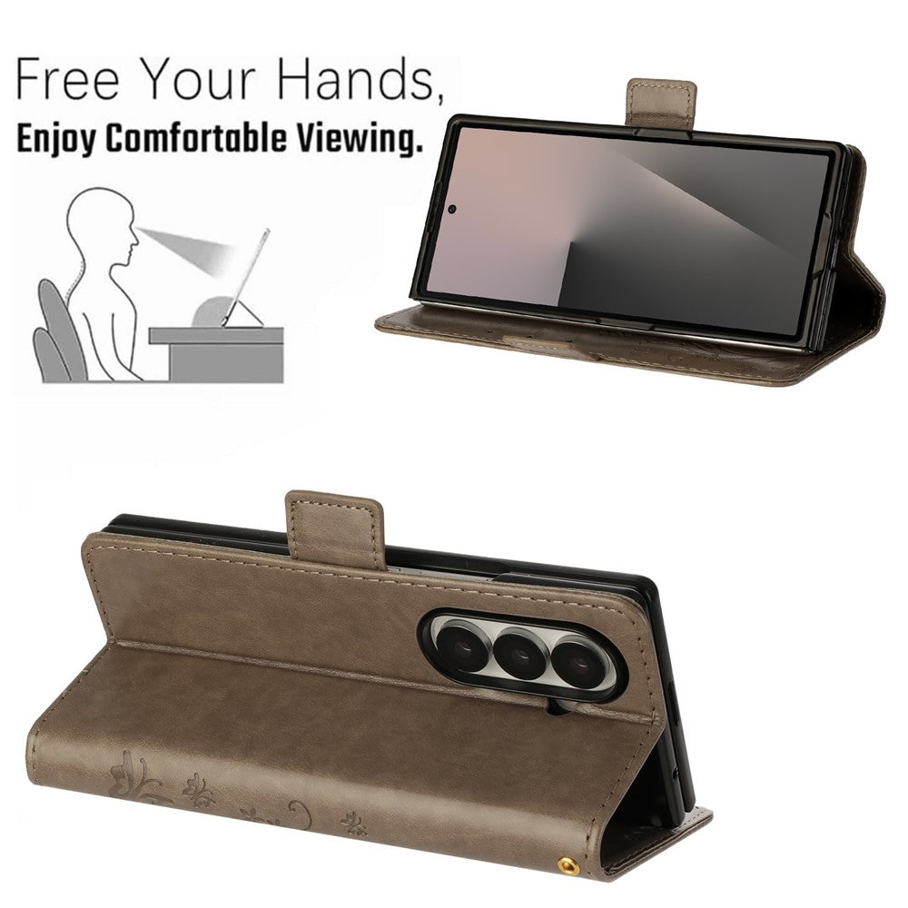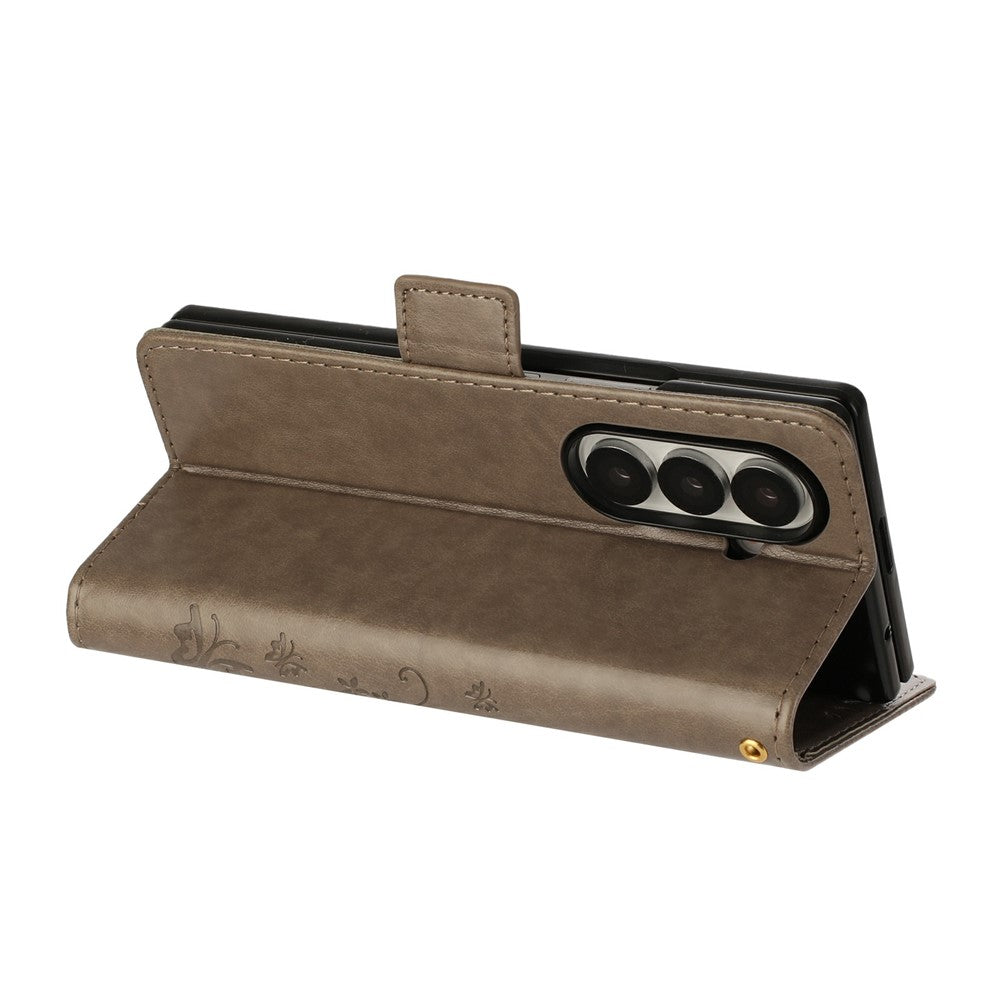 For Samsung Galaxy Z Fold7 5G Leather Wallet Case Butterfly Flower Imprint Phone Cover with Strap - Grey
