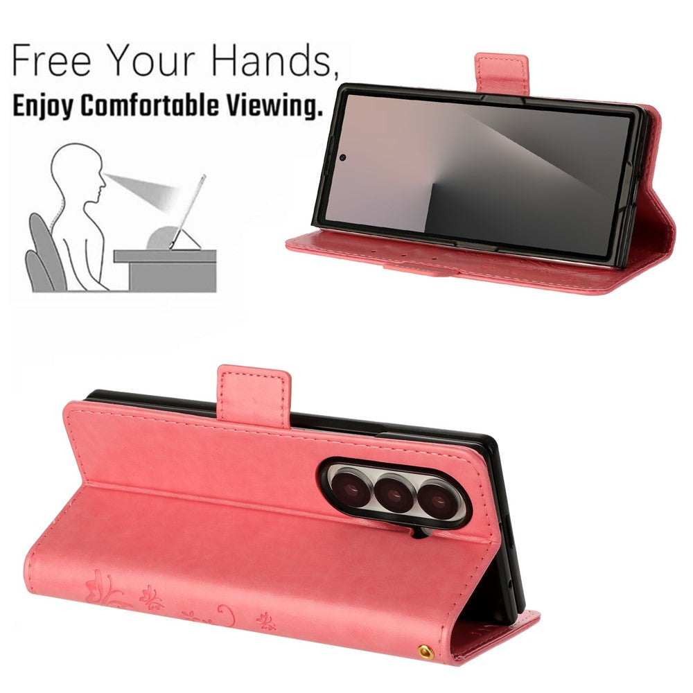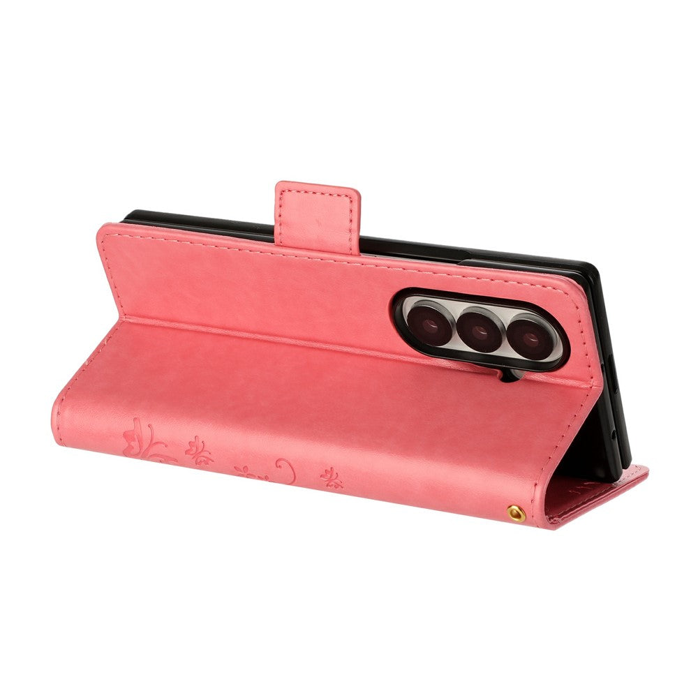For Samsung Galaxy Z Fold7 5G Leather Wallet Case Butterfly Flower Imprint Phone Cover with Strap - Pink