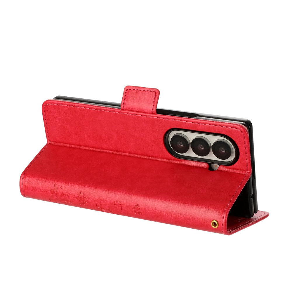 For Samsung Galaxy Z Fold7 5G Leather Wallet Case Butterfly Flower Imprint Phone Cover with Strap - Red