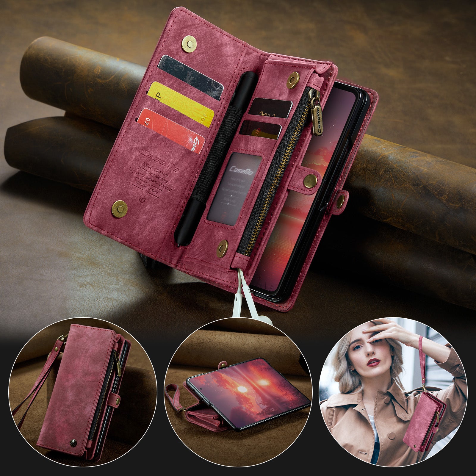 For Samsung Galaxy Z Fold7 5G Phone Cases CASEME 008 Leather Cover with Detachable Wallet and Strap - Red