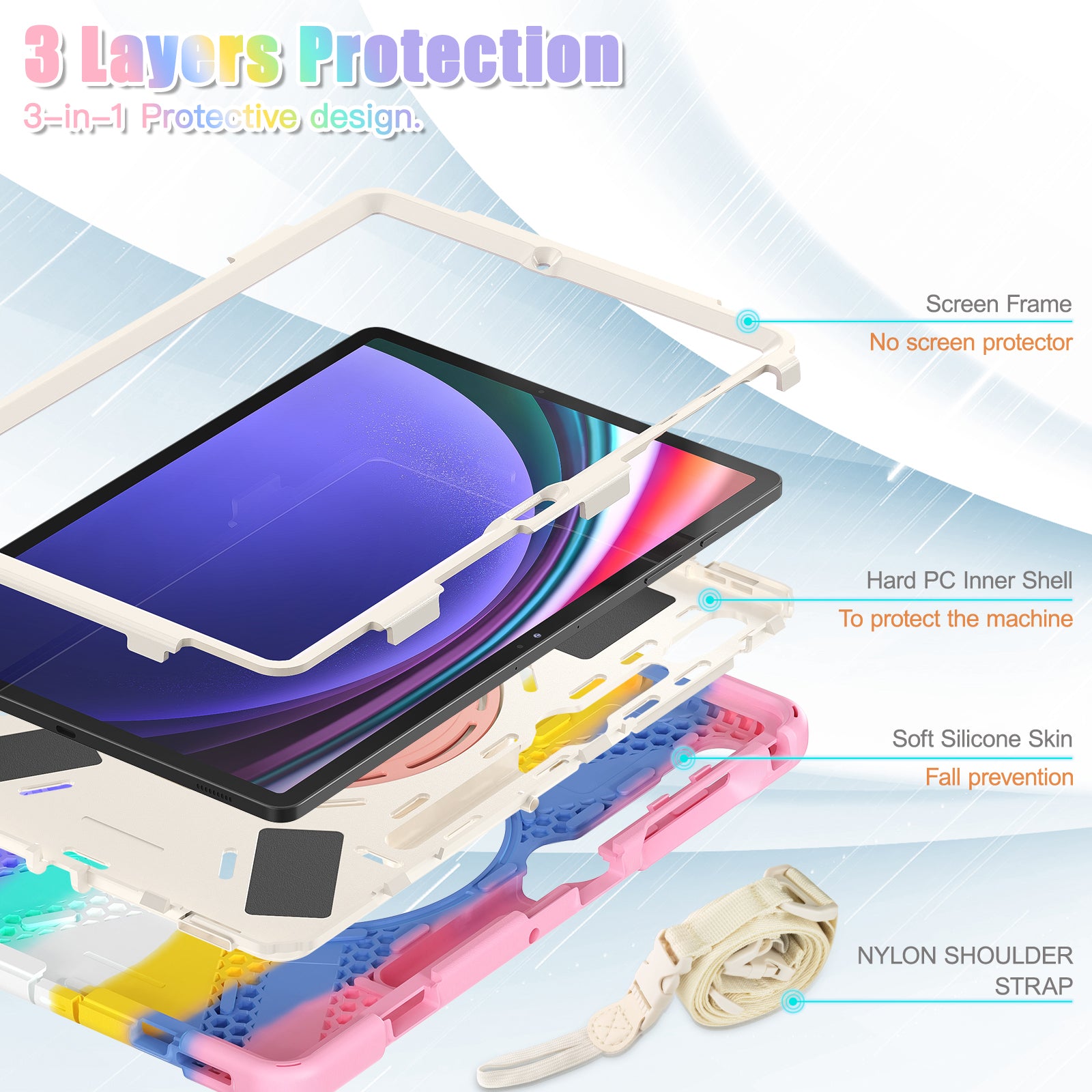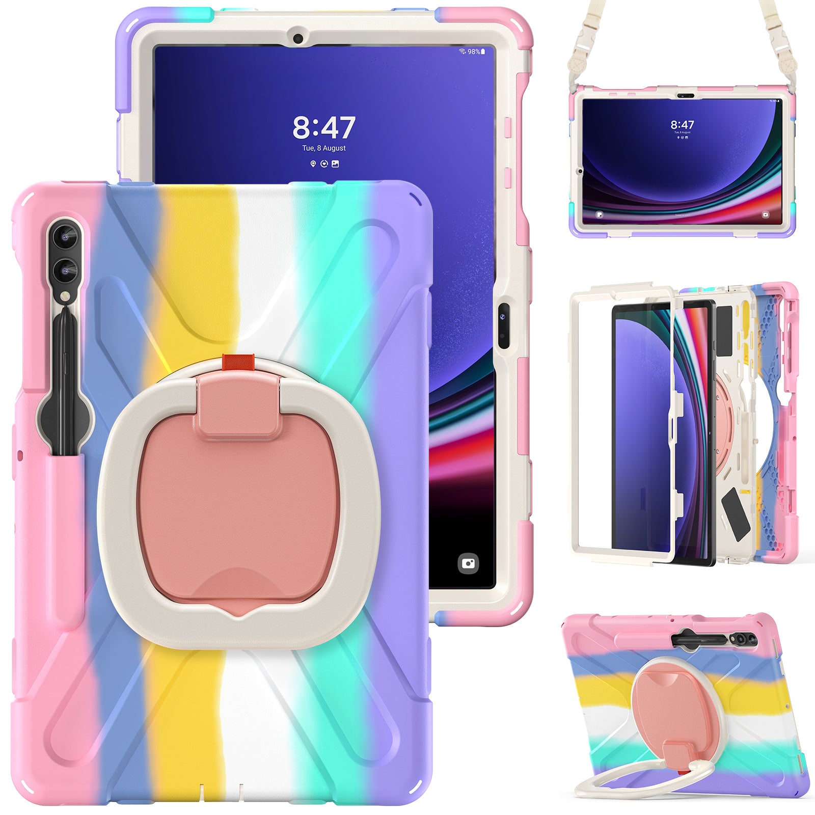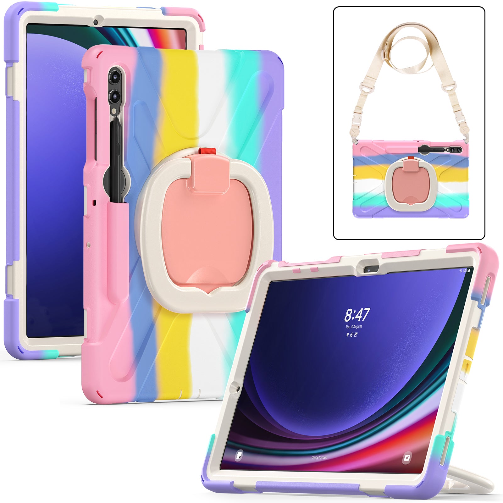 For Samsung Samsung Galaxy Tab S10+ X826 / S9 FE+ / S9+ / S8+ / S7+ Kickstand Tablet Case Shockproof PC+Silicone Cover, Shoulder Strap - Colorful Pink