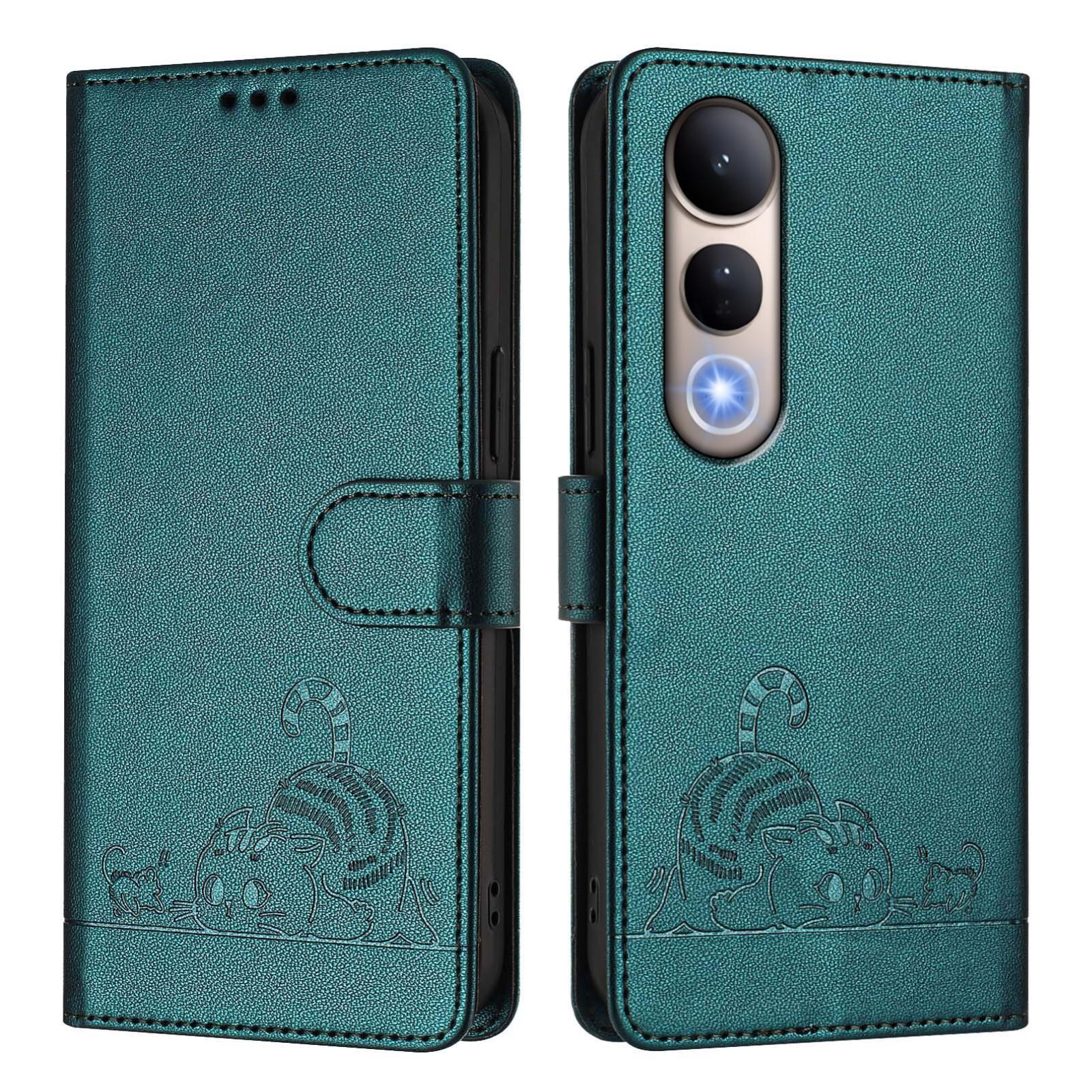 For vivo V50 Lite 5G Cat Rat Embossed Pattern RFID Leather Phone Case with Lanyard(Peacock Green)