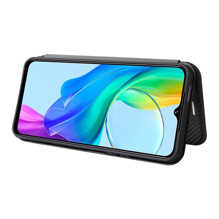 For vivo Y03 / Y18 4G Case Card Slots Leather Phone Cover Carbon Fiber Texture - Black