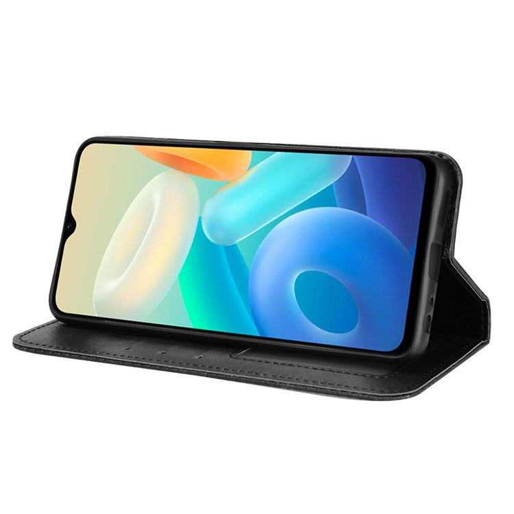 For vivo Y76s Vintage PU Leather Wallet Case Imprinted Mosaic Anti-fall Protection Magnetic Absorption Stand Flip Folio Phone Cover - Black