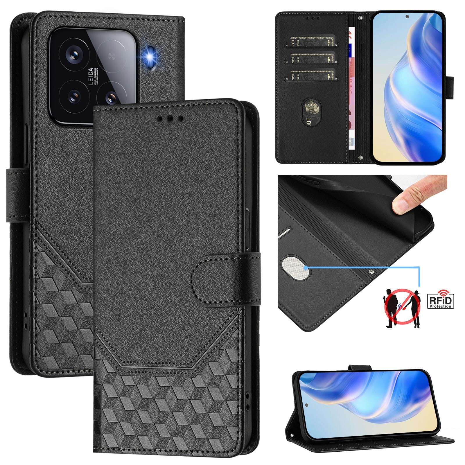 For Xiaomi 15 Case Imprinted Honeycomb RFID Blocking Leather Phone Cover with Strap - Black